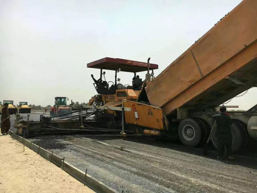云南陽光道橋購買的中大DT1600抗離析攤鋪機,十年無大修!在巴基斯坦PKM路面二分部瀝清中面層攤鋪順暢進行中!