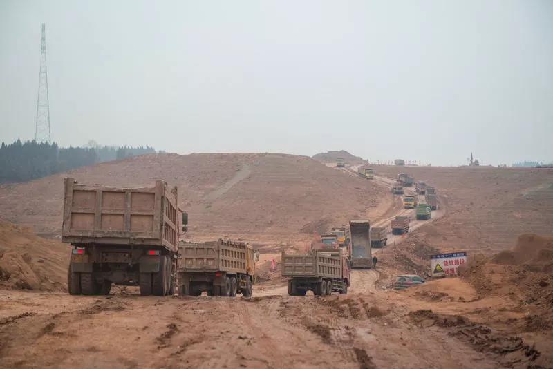 工程自卸車在機場建設便道上川流不息,從這兒能一窺填方高度